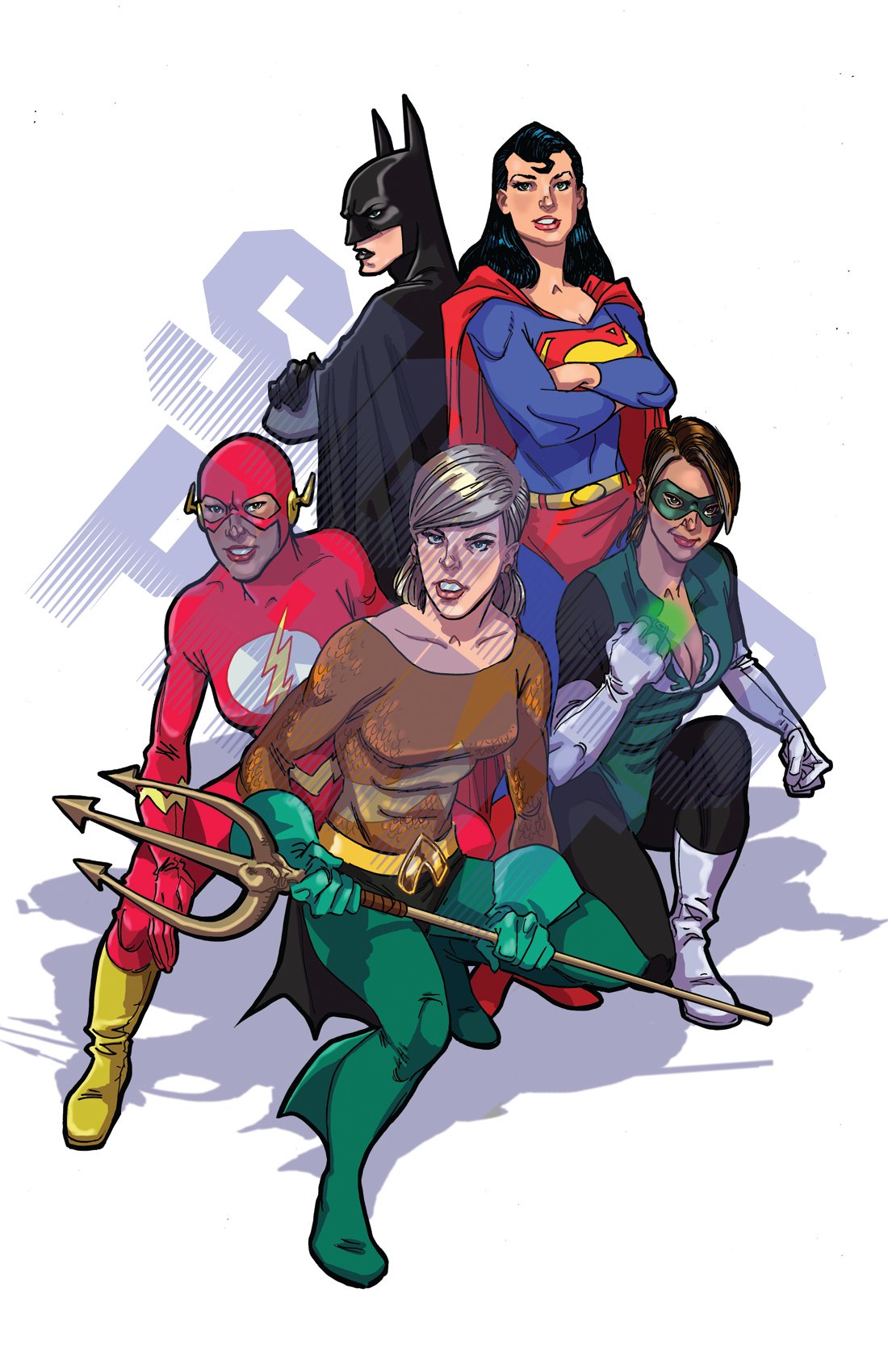 an 11x17 signed print (by the artist) of the Gender bending JLA featuring BatMa'm (Tallest Silver), SuperMa'm (Kit Quinn). AquaMa'm (Roxanna Meta), Flash (Psykitten Pow) and Green Lantern (Mia Ballistic)